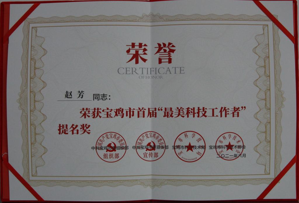 近日,寶光股份趙芳在中共寶雞市委組織部、中共寶雞市委宣傳部、寶雞市科學(xué)技術(shù)局、寶雞市科學(xué)技術(shù)協(xié)會聯(lián)合開展的“尋找寶雞最美科技工作者”評比活動中,被授予2021年“優(yōu)秀科技工作者”提名獎(jiǎng)。