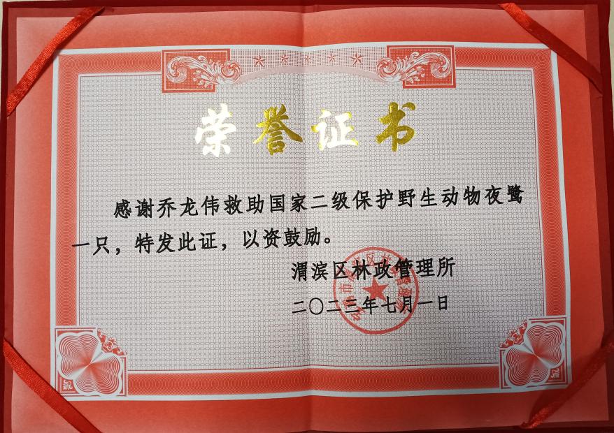 近期,寶光股份零件產品制造部喬龍偉同志成功救助一只夜鷺,獲渭濱區林政管理所表彰。