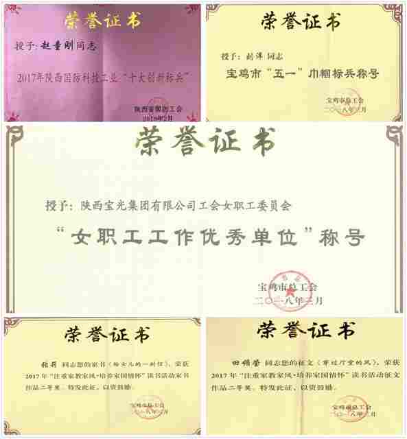 寶光集團女工委榮獲寶雞市總工會女職工工作優秀單位;精密陶瓷公司趙童剛同志榮獲陜西省國防科技工業“十大”創新標兵;進出口公司劉洋同志榮獲寶雞市“五一”巾幗標兵;C產品制造部田媚瑩同志在寶雞市“注重家教家風  培養家國情懷”讀書征文活動中榮獲二等獎;A產品制造部張莉同志在寶雞市讀書活動中榮獲家書作品二等獎。