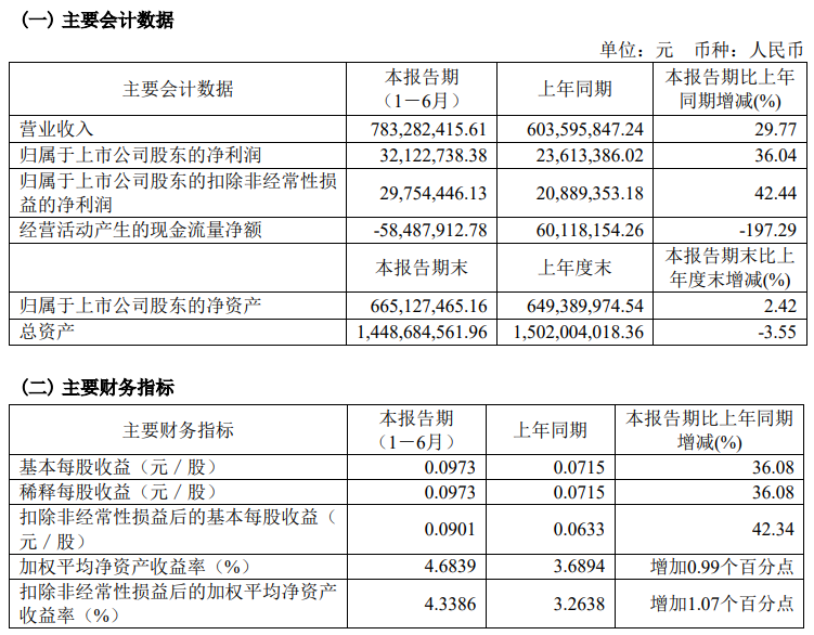 寶光股份2023年半年度主要財務指標