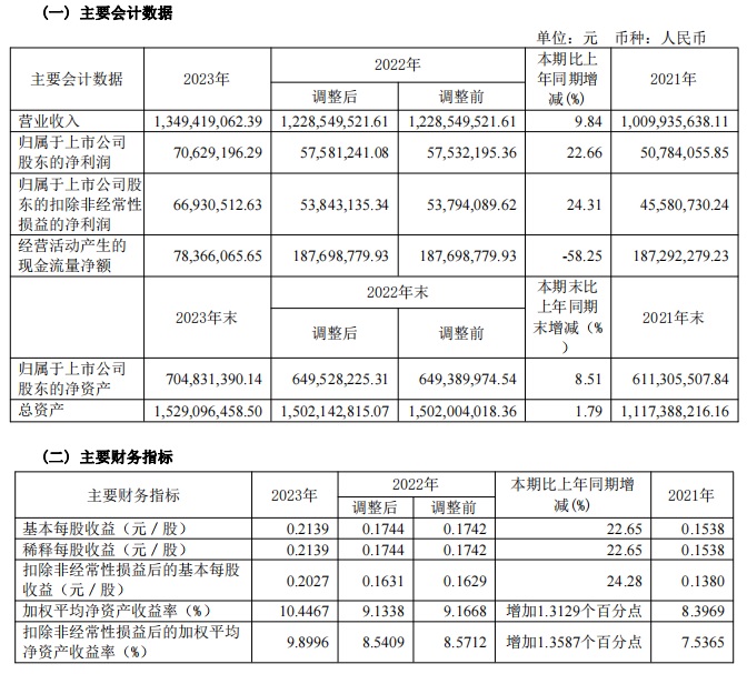 寶光股份2023年度主要財務(wù)指標(biāo)